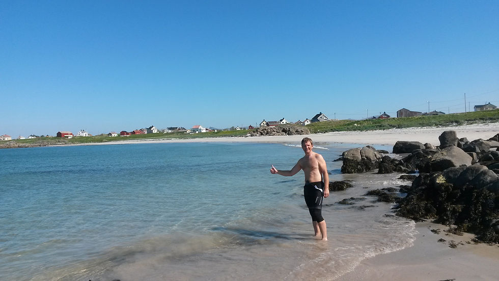 Spiste en nydelig frokost på Marena hotell i Andenes, før vi startet nedover vestsiden av Andøya. Terrenget var ganske flatt ut mot havet, men fortsatt høye fjell rett på innsiden. Det var mange flotte sandstrender, finere enn i syden. Veldig fristende med et bad helt frem til vi duppet tærne i vannet. Det var vel ca 6 grader, ingen bading i dag.
