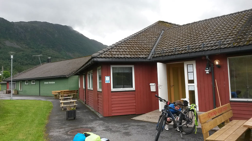 En ferje og inn i en ny stigning, sikk/sakk kjøring mellom kuer og kuruker før det ble en rask nedkjøring til Svelgen, hvor vi har tatt inn på Bremanger Fjordhotell.